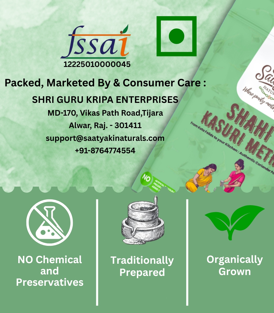 At Saatyaki Naturals, we bring you carefully hand-dried and naturally preserved Shahi Kasuri Methi, ensuring maximum aroma, purity, and flavor in every pinch. Experience the royal essence of this timeless Indian spice!