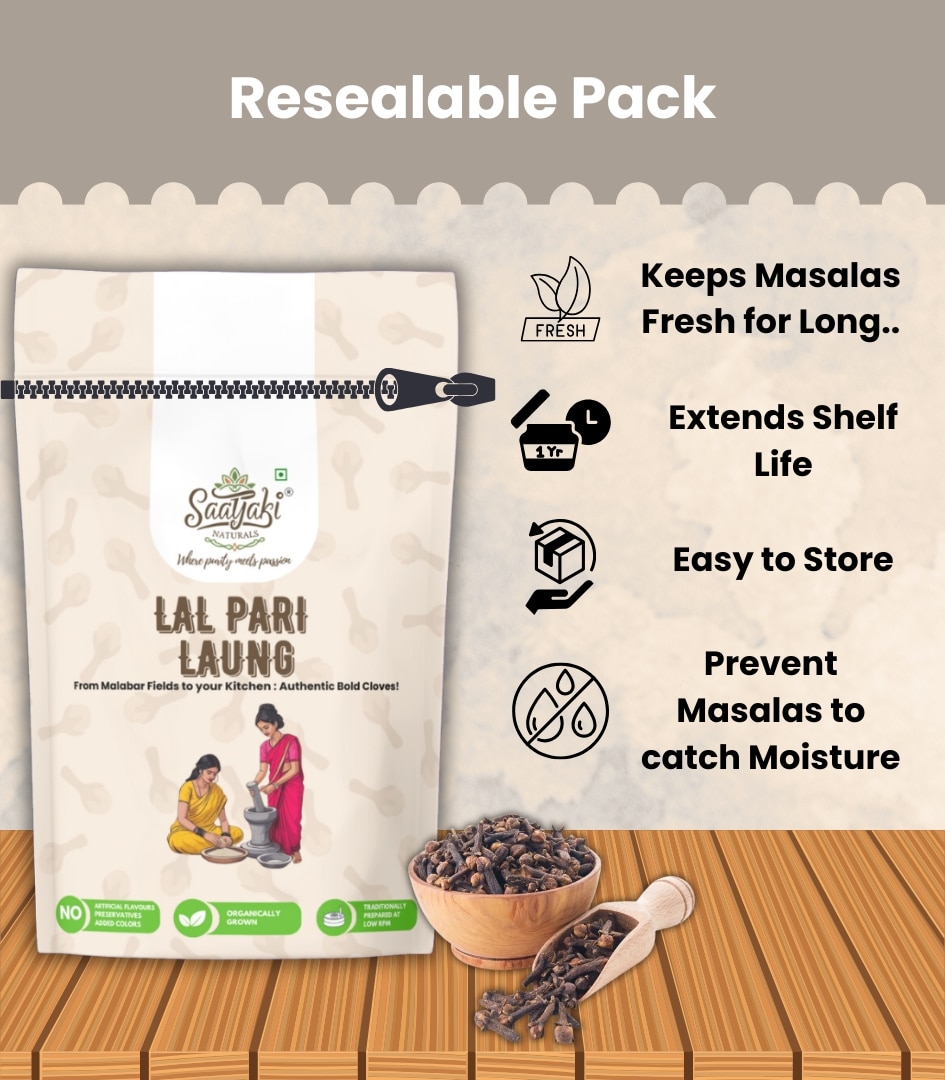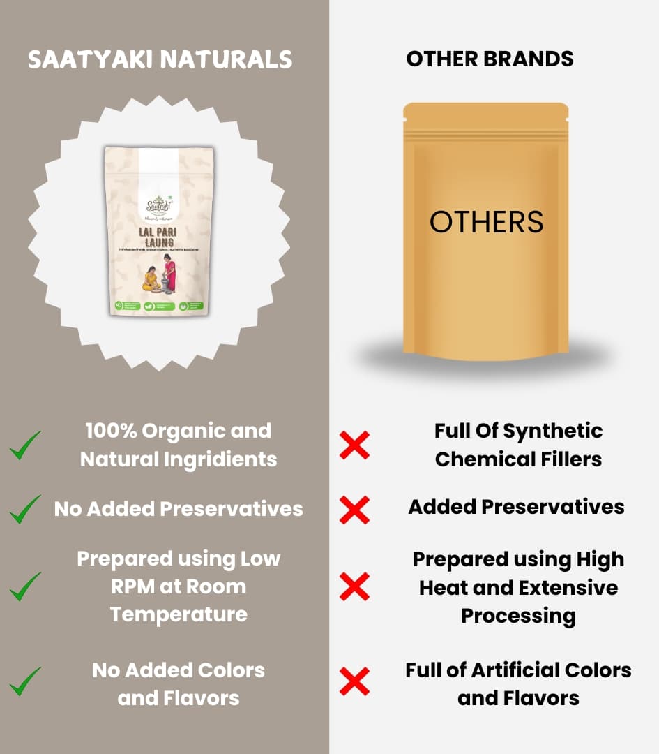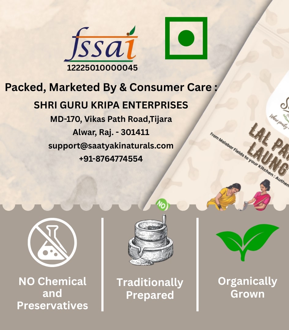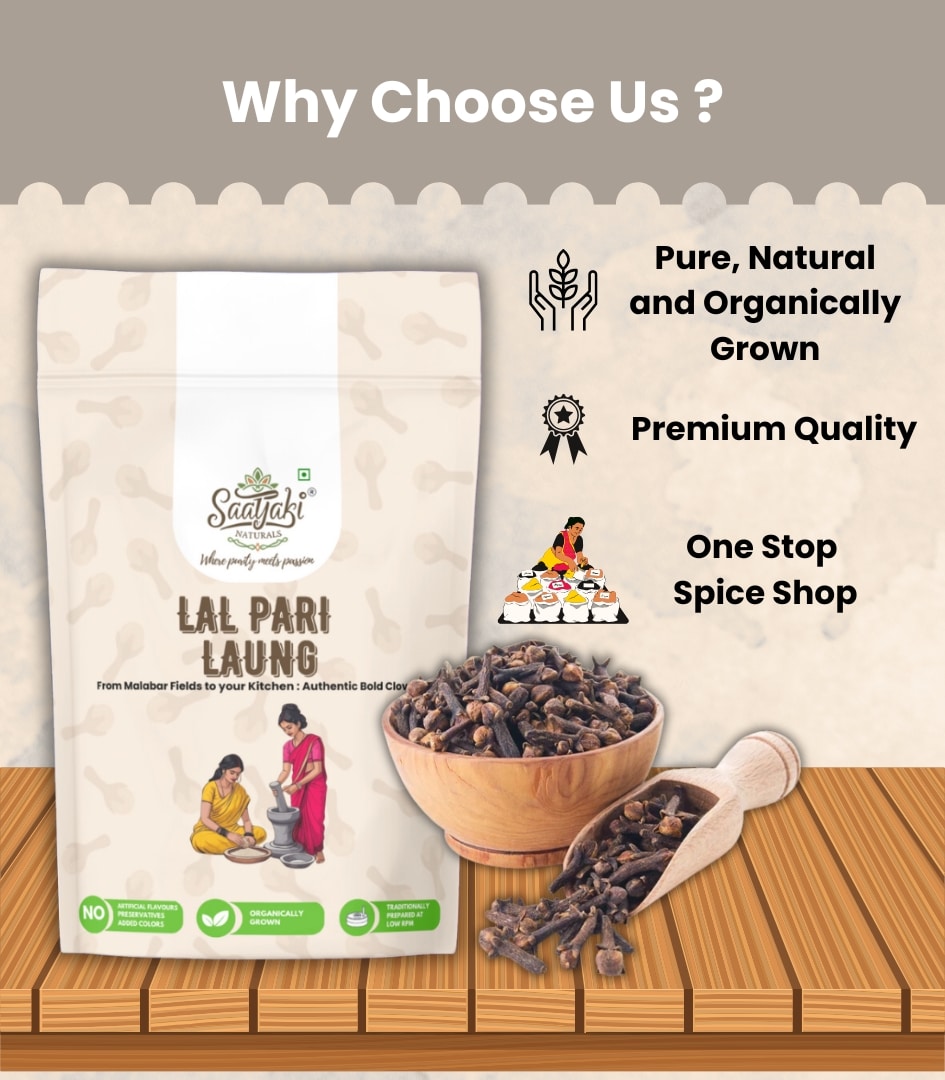 At Saatyaki Naturals, we ensure that every spice is organically sourced, handselected, and sun-dried for maximum freshness and intensity. Elevate your dishes with the unmatched aroma and purity of Lal Pari Laung – the finest clovevariety for a truly royal experience.