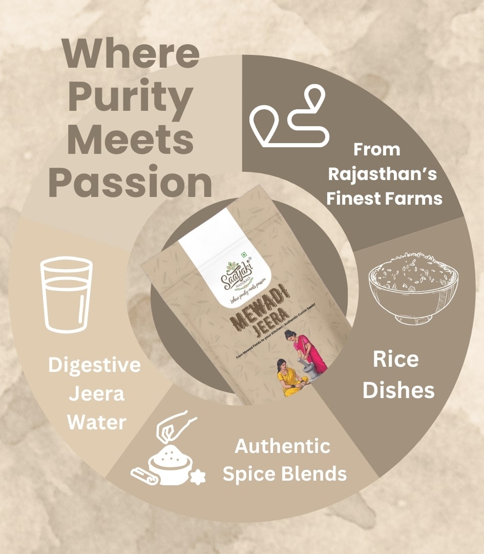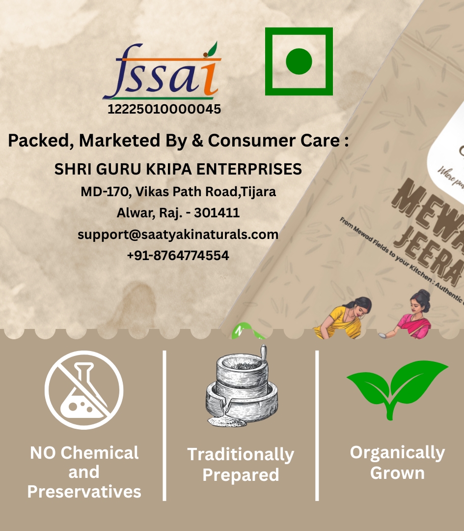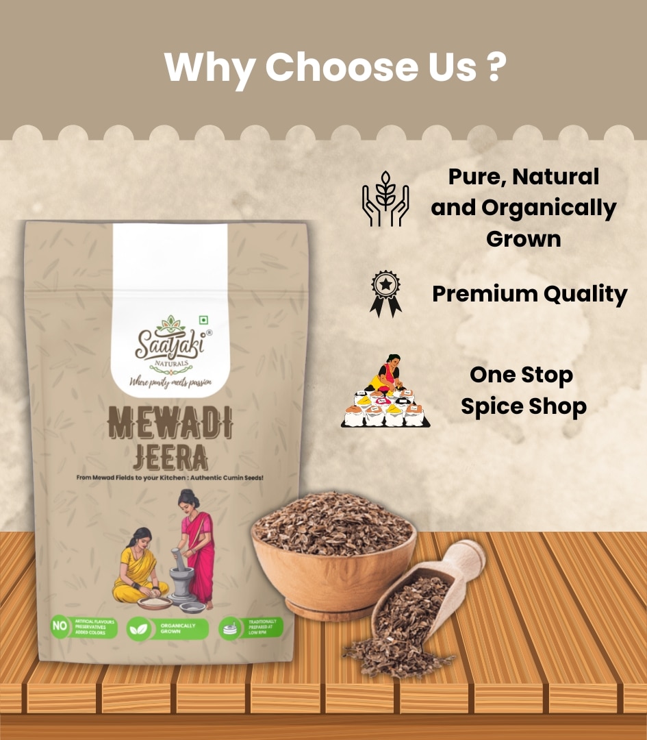 At Saatyaki Naturals, we ensure our Mewadi Jeera is sun-dried, hand-selected, and packed with care, bringing you the purest, most aromatic cumin for an authentic taste experience. Elevate your cooking with the essence of Mewar!