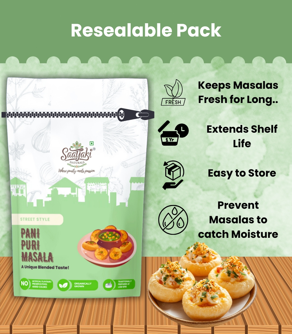 Bring the authentic taste of Indian street food home with Saatyaki Naturals Pani Puri Masala. This expertly blended spice mix adds a mouthwatering burst of tangy, spicy, and minty flavors to your golgappa or pani puri water. Made from handpicked, sun-dried ingredients, this masala creates the perfect teekha-meetha balance that turns every puri into a flavor explosion.
