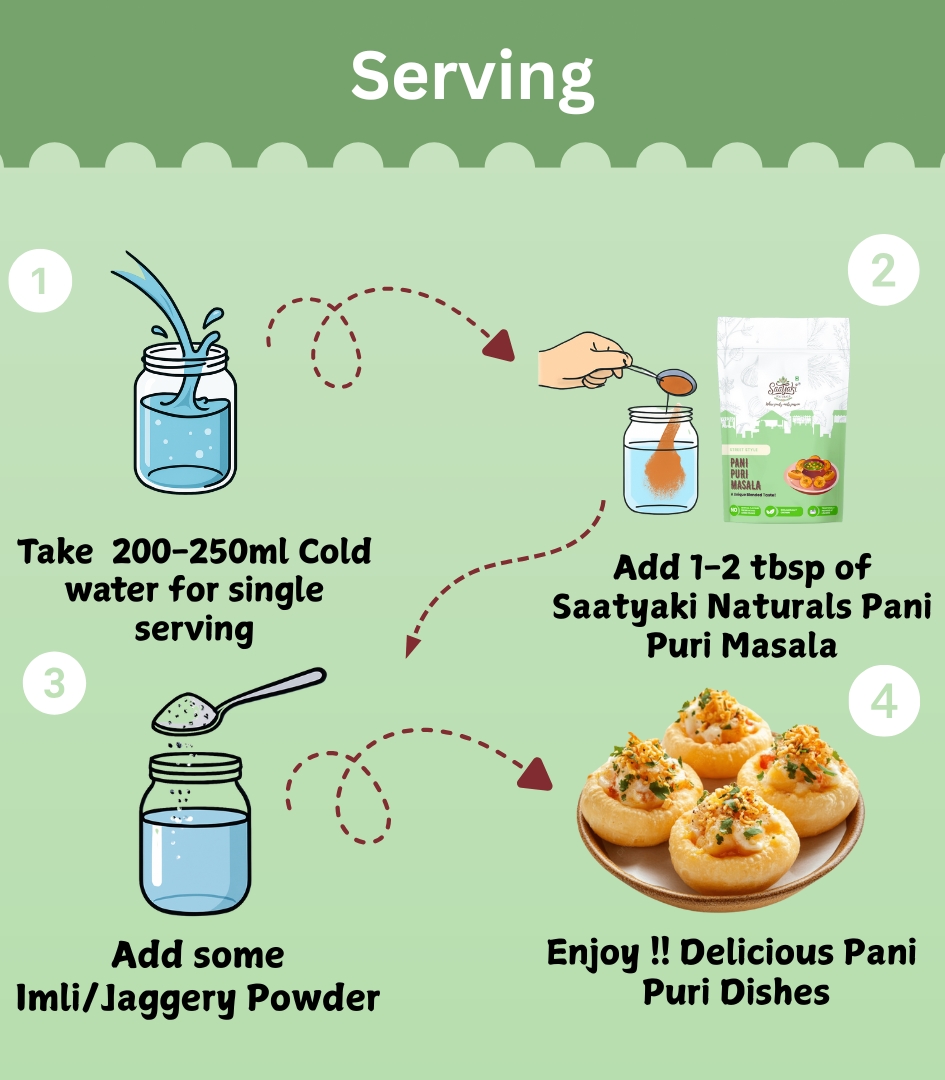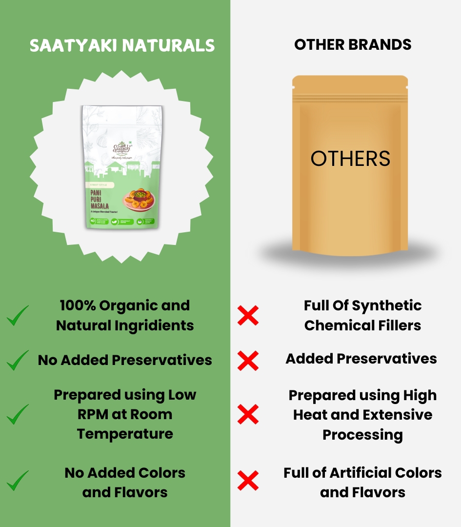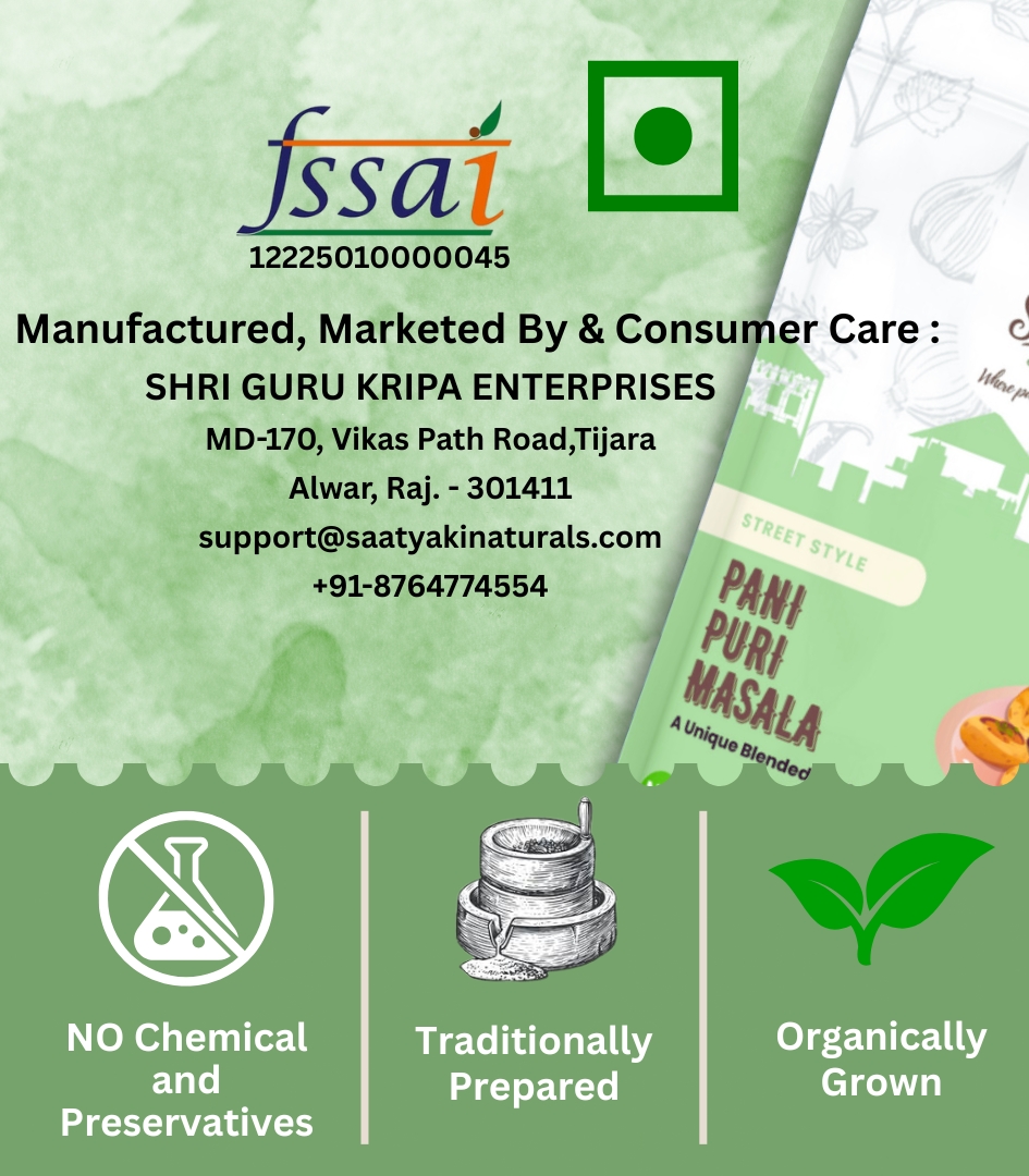 At Saatyaki Naturals, we craft our Pani Puri Masala using traditional techniques and carefully selected spices like black salt, roasted cumin, dry mango powder, and mint. The result? A perfectly balanced, natural masala that captures the true essence of Indian street food — fresh, flavorful, and irresistibly chatpata.