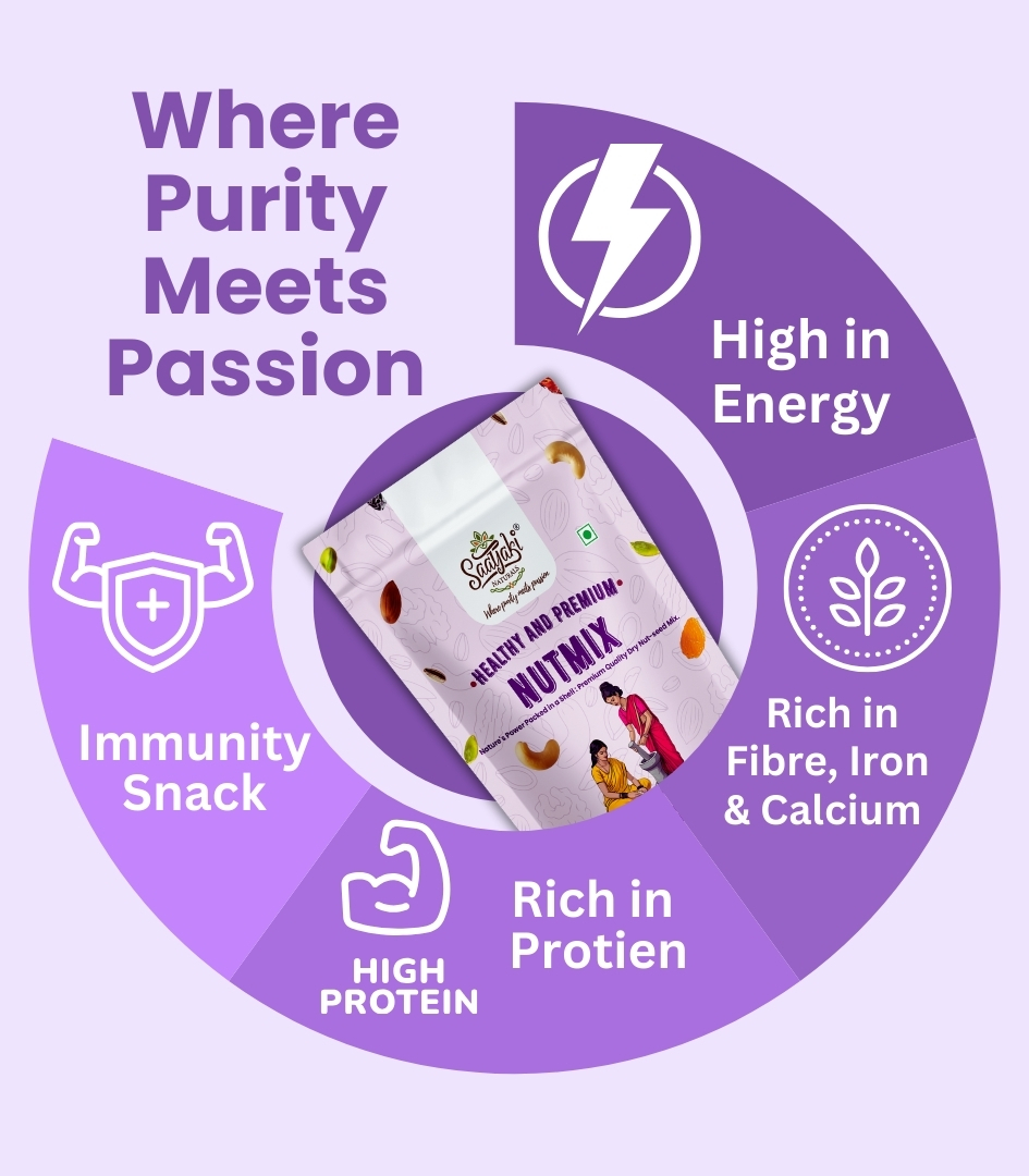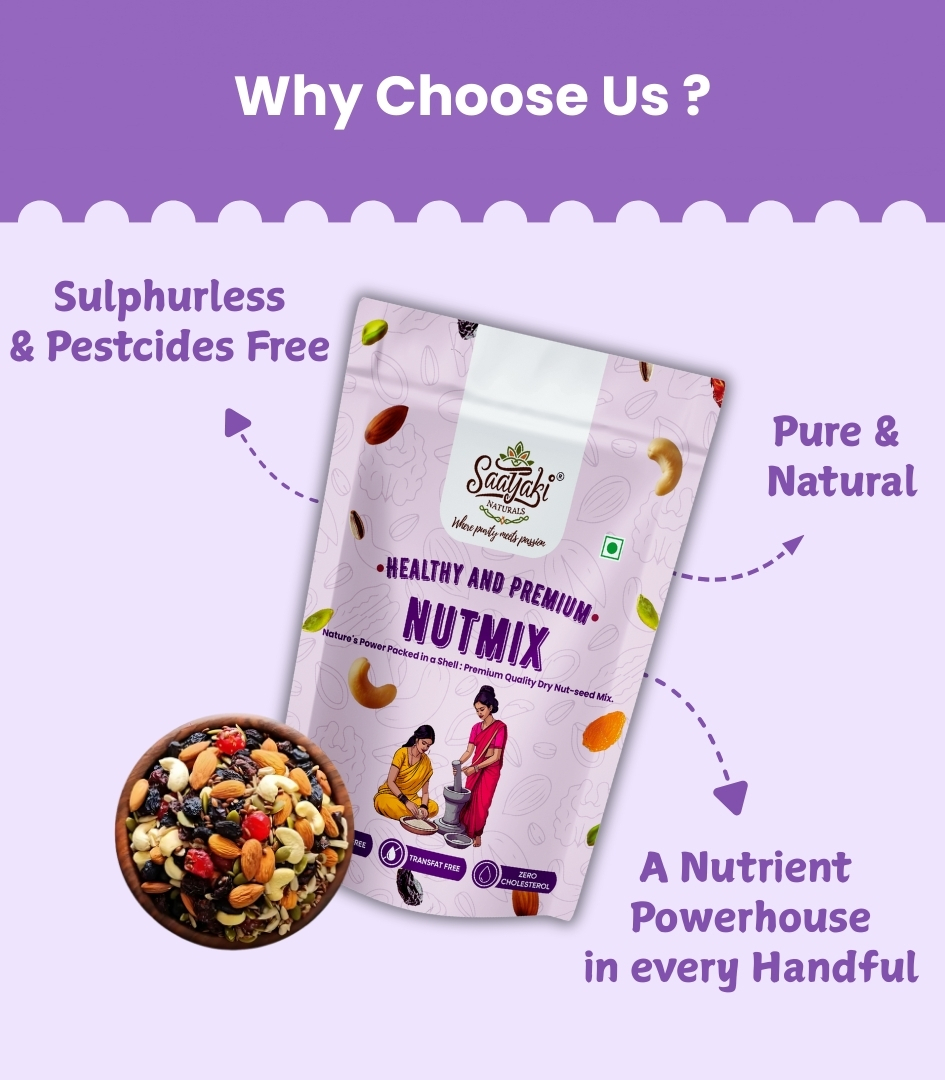 Elevate your daily nutrition with Saatyaki Naturals Premium Nutmix, a thoughtfully crafted mixture of high-quality nuts and seeds. Each ingredient is hand-selected for purity, taste, and nourishment—giving you a wholesome snack that fuels your body naturally. Rich in essential vitamins, minerals, and healthy fats, this premium nut mix delivers long-lasting energy and supports overall wellness.