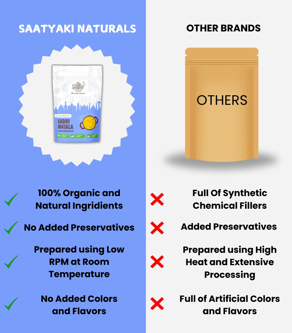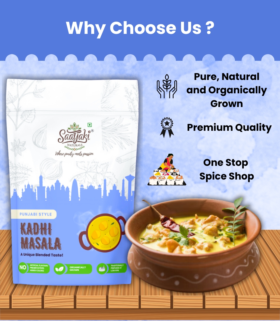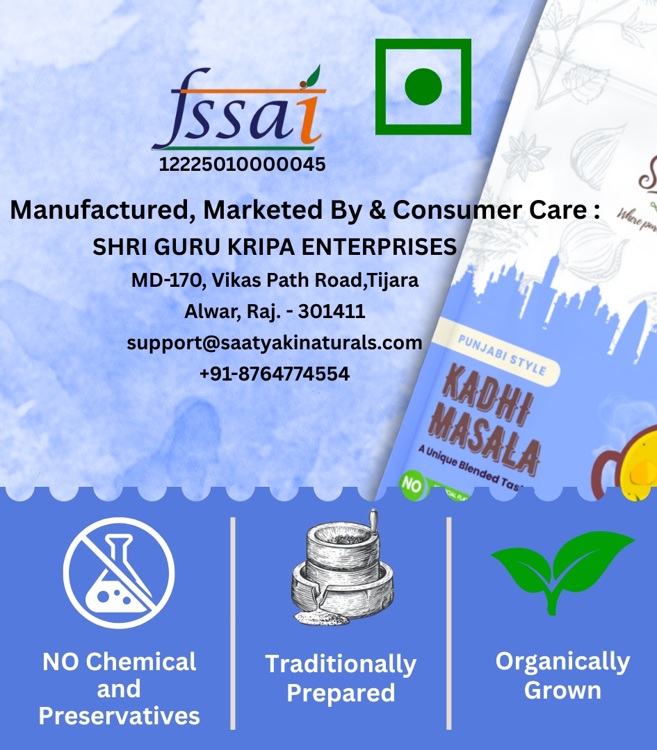 At Saatyaki Naturals, we ensure that our Punjabi Kadhi Masala is crafted from premium-quality, naturally processed spices, delivering an authentic, homestyle taste in every bite. Elevate your meals with the true essence of Punjab!