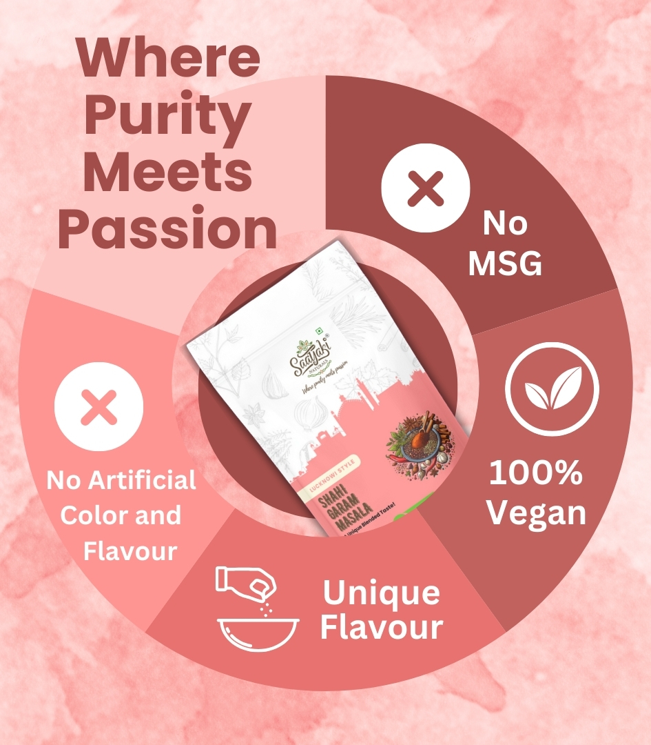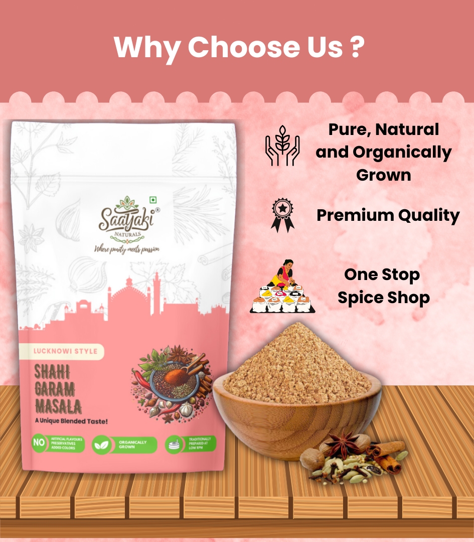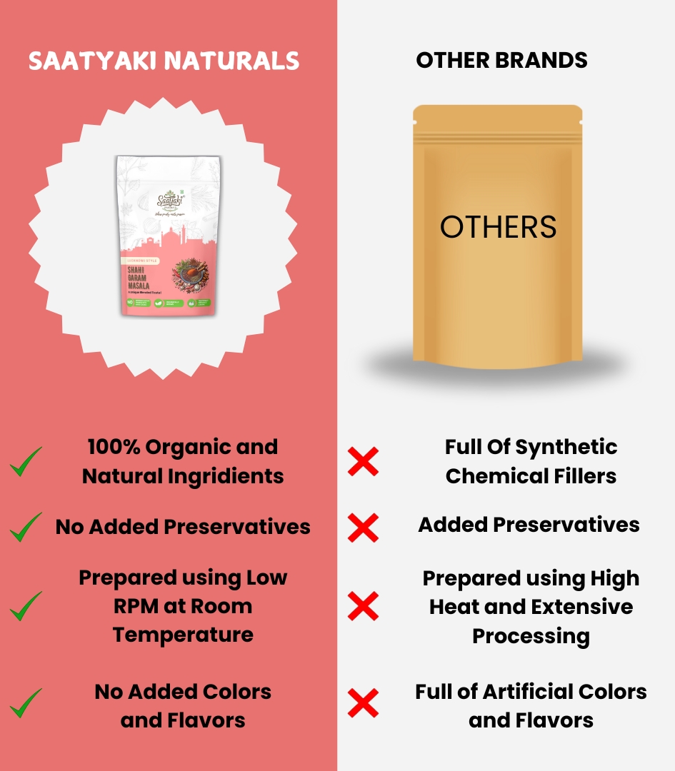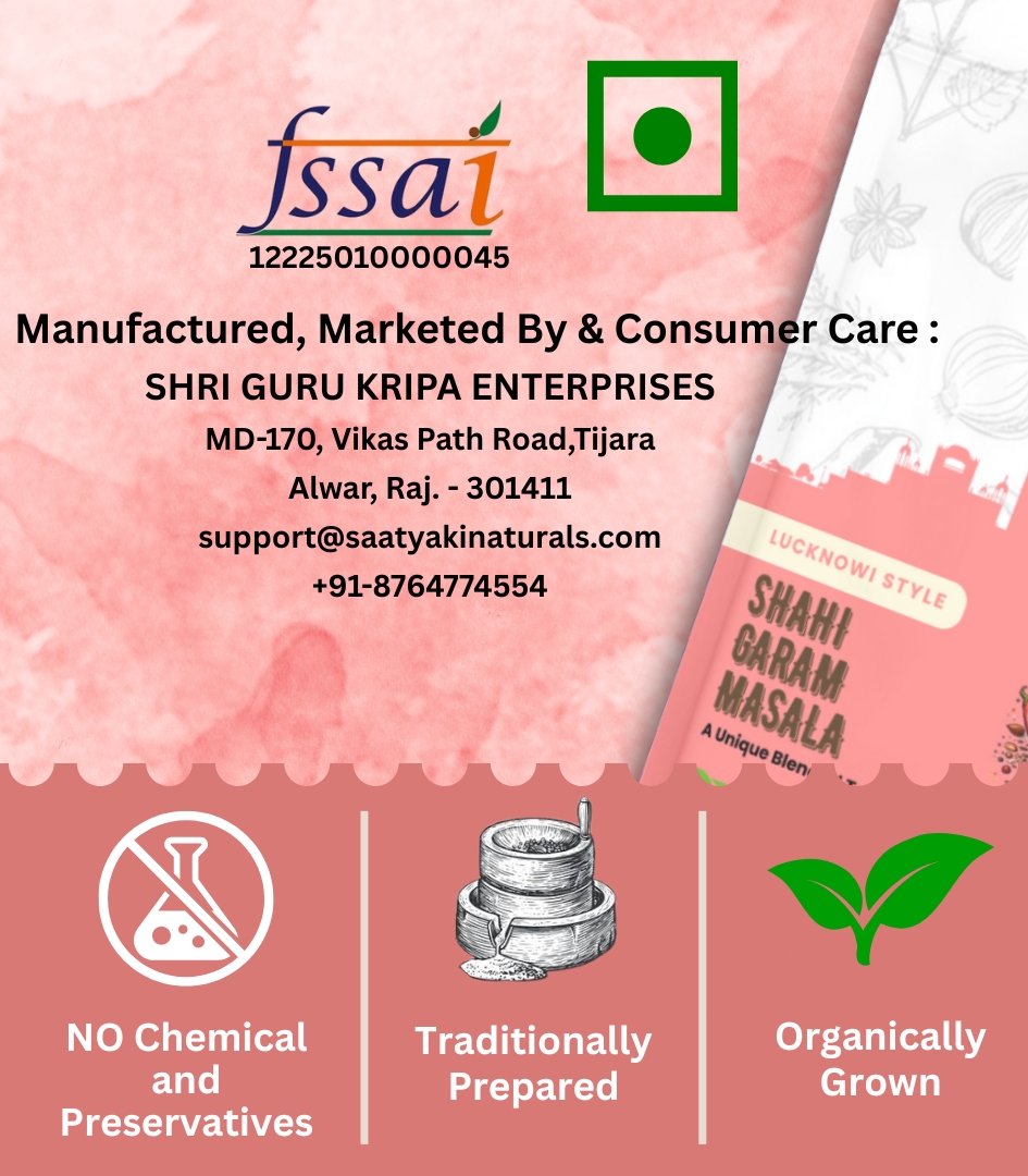 At Saatyaki Naturals, we ensure our Shahi Garam Masala is made with the finest-quality spices, preserving their natural oils and intense aroma. Experience the luxurious taste of royalty in every dish you prepare!
