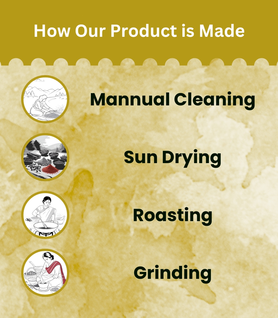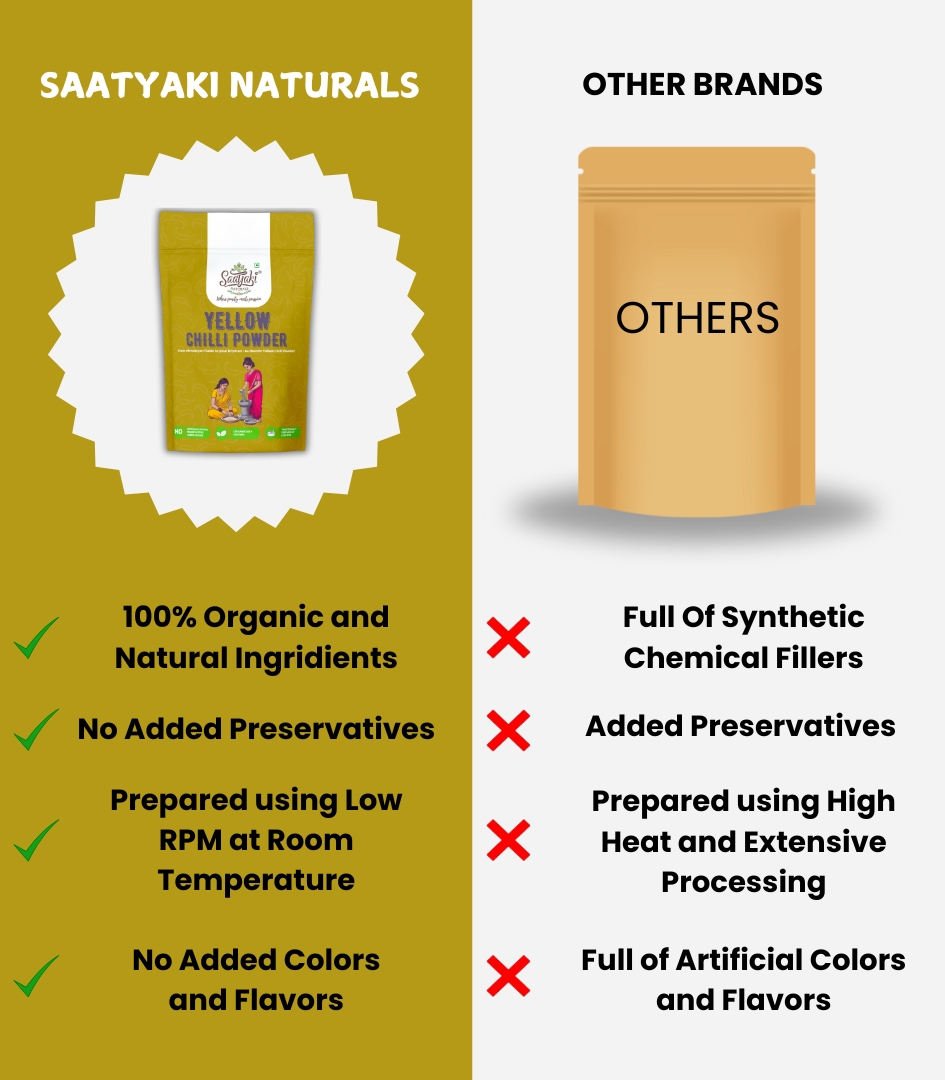 At Saatyaki Naturals, we ensure that our Yellow Chilli Powder retains its natural color, aroma, and heat, delivering authentic taste and unmatched quality to your kitchen. Experience the golden touch of premium spice!